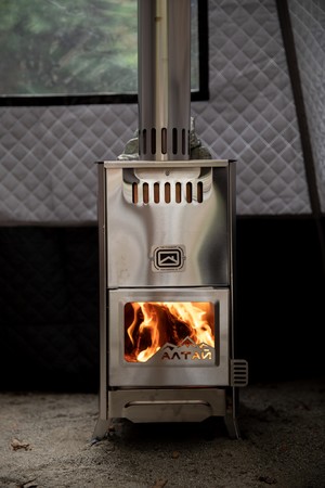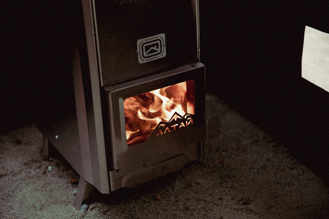 付属の薪ストーブ「アルタイ」の耐熱ガラス扉によって、扉を開かなくても薪の燃焼具合が確認できます。炎の灯りがテント内を暖かく照らし、薪が燃える音と揺らぐ炎を眺めながら、ゆったりとした時間を楽しめます。