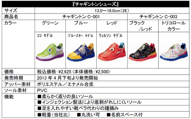 今回発売の「チャギントン」シューズシリーズ第一弾は、そのユーモラスで可愛らしいチャギントンの主人公3人(ウィルソン、ブルースター、ココ)をそのままモチーフにした“チャギントンC-001”と、カラフルなプリントが特長の “チャギントンC-003” の2タイプ5色のラインアップで、価格は2,625円(税込)です。