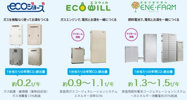 ブルー&グリーンプロジェクトの対象機器である「エコジョーズ」・「エコウィル」・「エネファーム」の名称は、製造・販売に関わるガス機器メーカー・ガス事業者が統一した名称として使用しています。