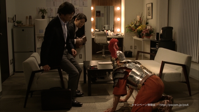 「…お願いします。」シーンは楽屋。「そんな急にスケジュール調整は出来ないよ。」と困った様子で返す事務所スタッフに食い下がる山田孝之、新しいお仕事の衣装だと思われる鎧を身に纏っています。「バイオハザード、GODEATER、龍が如く、ONE PIECE…」続々と発売を控える新作タイトル名を読み上げていく様子に、スタッフは一瞬理解できず唖然。どうしても休みを取りたかった山田さんが選んだ最終手段、その決死の土下座と、鬼気迫る眼力にご注目ください。