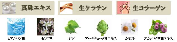 真珠エキス/生ケラチン/生コラーゲン/ヒアルロン酸/センブリ/シソ/アーチチョーク葉エキス/カミツレ/アカツメクサ花エキス