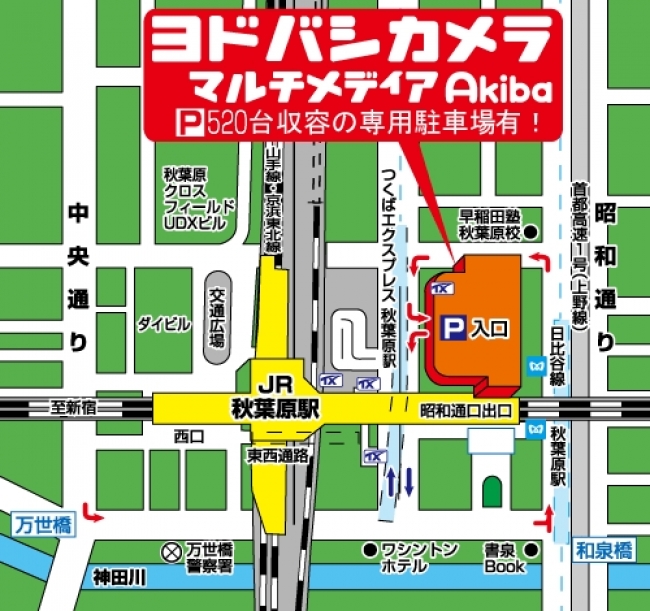 秋葉原駅の5路線(つくばエクスプレス、東京メトロ日比谷線、JR山手線・総武線・京浜東北線)に直結。
