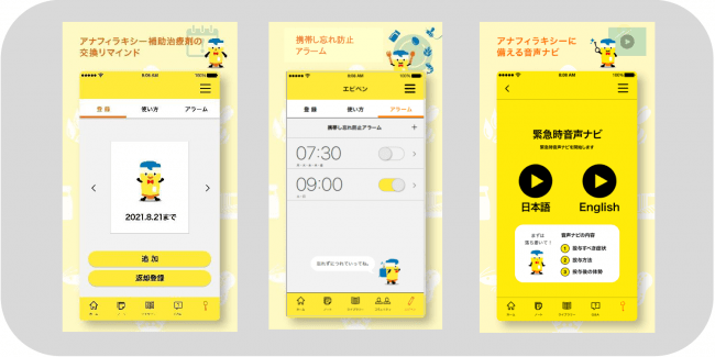 ・エピペン携帯し忘れ防止アラーム:エピペン携帯のリマインダーとしてアラームを設定することができます。