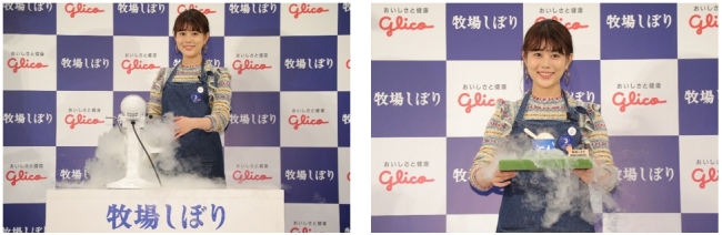 その後、ストアで販売するアイスと同じように、新鮮なミルクを使ったアイスづくりに挑戦していただきました。液体窒素を使う調理方法にやや緊張気味の高畑さんでしたが、液体窒素を注入した瞬間、白い煙が辺り一面に広がり、「もくもくしてます!」と喜びの表情を浮かべていました。また、白い煙に手をかざす無邪気なシーンもありました。そして、完成したアイスを試食した際には、「新鮮で本当にミルクが濃厚です!」とアイスが大好きなことが伝わる感想もいただきました。また、ストアで商品を提供する際に使用する、白煙が出る仕掛けが施された特製の“もくもくプレート”を見た時は、「お店でしか楽しめない、インスタ映えなアイスですね!」と見た目や雰囲気でも楽しめる演出に興味津々な様子でした。