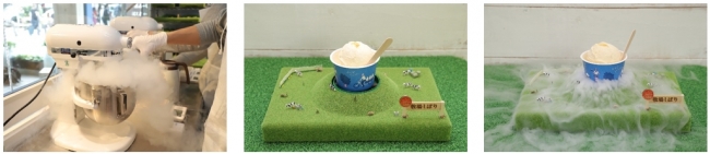 本ストアで提供するアイスのメニューは、牧場しぼりの原料に液体窒素を入れてその場で調理する、“新鮮ミルクを使ったできたてアイス”です。調理中は白い煙がもくもく立ちこめ、あたり一面真っ白になるムービージェニックなパフォーマンスが見どころ。また、イートインメニューでは、牧場をイメージした”もくもくプレート”を使って商品をご提供します。プレートの下部分にドライアイスが入っており、着席後に店員がお湯をかけることで白い煙がもくもく湧き出る、思わず撮影したくなる楽しい演出をご用意しています。