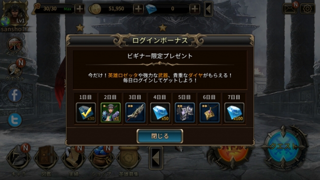 これは7日間ログインすることで、パーティメンバーである「英雄」や序盤ではかなり強力な装備品などが手に入ります。ぜひ冒険にお役立てください。