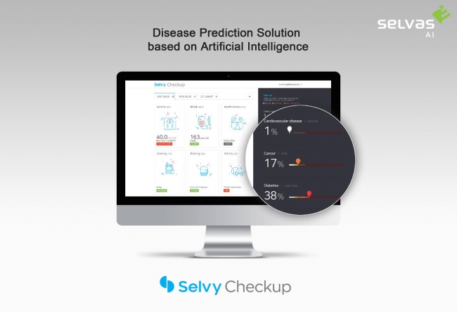 「セルビーチェックアップ」は日本初のディープラーニング技術を適用した疾病予測サービスであり、個人の健康診断記録を入力すれば主要6大がんの発症リスクを含め心臓・脳の血管疾患、糖尿、痴ほうなどの主要な成人病が3年以内に発症する確率を予測できるメディカル人工知能ソリューションである。