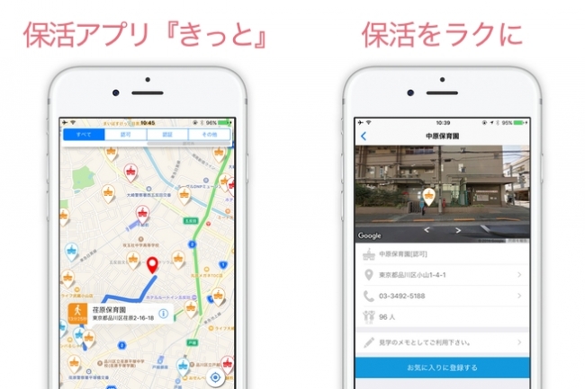 『きっと』は、「自宅周辺の保育園がまとまっておらず探すのが面倒」「自宅から保育園まで徒歩何分なのかわからない」そんな課題を解決するアプリです。地図上に保育園を表示し、自宅から徒歩何分何秒かかるかを表示できます。また、お気に入り登録し、入園希望順に並び替えることもできます。保育園見学の際のメモ機能も導入しております。