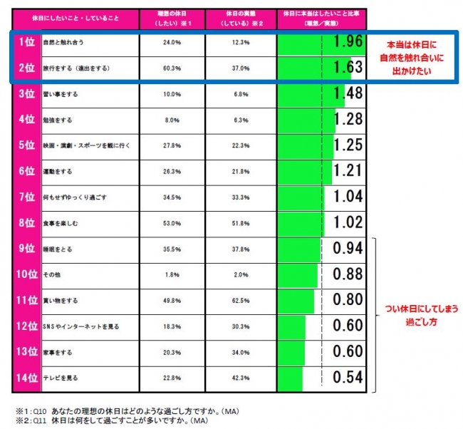 理想の休日の過ごし方と、その現実(実態)について質問すると、やりたいのにできていない比率が高かったのは「自然と触れ合うこと」でした。「自然と触れ合うこと」が理想の休日であると思う人が24%に対し、現実の休日で自然と触れ合えている人は12%となり差異は1.96倍となり、倍率第1位となりました。