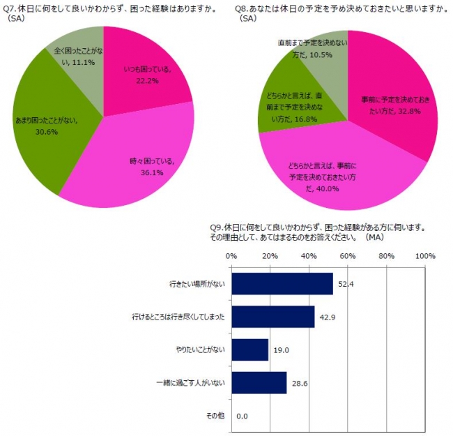 「休日に何をして良いかわからず、困った経験」について聞いたところ、「いつも困っている」が22%、「時々困っている」が36%と合計58%もの人が、休日の過ごし方について困っていることがわかりました。さらに、困った経験のある方に、その理由を伺ったところ、「行きたい場所がない」が52%、「行けるところは行き尽くしてしまった」が42%という回答が上位を占めました。「休日の予定を予め決めておきたいか」という質問に対しては、「直前まで予定を決めない方だ」が10%、「どちらかと言えば、直前まで予定を決めない方だ」が16%と、3人に1人がぎりぎりまで予定を立てないことが明らかになりました。