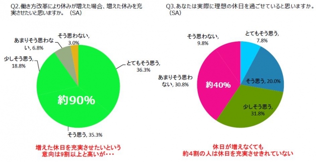 近年では、働き方改革により休暇取得の促進を行なう企業も増えてきています。そのような中で、調査対象者全員に「働き方改革により休みが増えることは嬉しいか」質問したところ、およそ3人に1人が嬉しくないと回答。また、嬉しくないと回答した人にその理由について聞いたところ、全体の32.6%が「過ごし方が分からない」「休みの日にすることがない」と回答しました。また、「休みを充実させたいか」「理想の休みを過ごせているか」という設問の差分からおよそ3割の人が休日の過ごし方に悩んでいたことが分かりました。