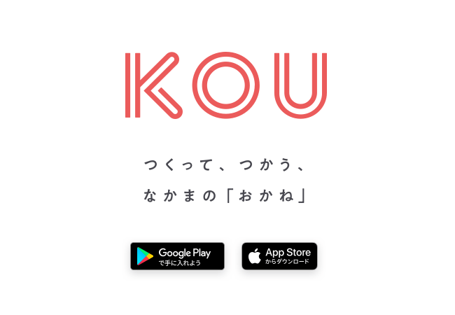 『KOU』は、スマホで簡単にコミュニティを作り、仲間と一緒にオリジナルの「おかね」をやりとりできるサービスです。仲間に感謝の気持ちを伝える新たなツールとしてご利用いただけます。『KOU』を使うことで、コミュニティ内の感謝を循環させ、メンバー相互の関係性の質を高めることが期待できます。