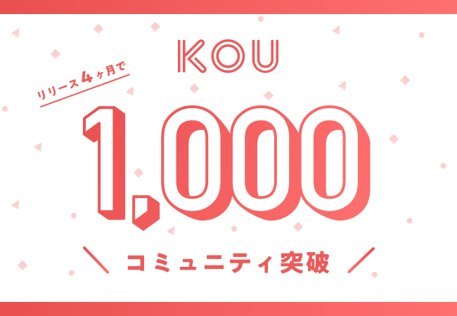 『KOU』は2018年9月にiOS版、12月にAndroid版を提供して以来、多くの方にご利用いただいております。その導入実績として、2018年12月時点で『KOU』内で作成されたコミュニティ数が1,000を突破いたしました。4ヶ月弱でここまでの急拡大を実現できたのも、ご利用者様含め『KOU』に関わるみなさまのおかげです。心より感謝申し上げます。