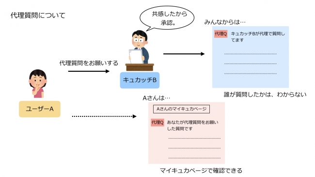 代理質問は、代理質問が依頼されたあとに、その質問に共感したユーザーが質問者に代わり質問を投稿するものです。代わりに質問を投稿できるのは、キュカッチと呼ばれる特別な権限を与えられたユーザーのみになります。