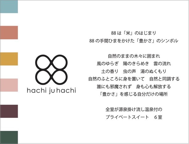 米屋の原点である「お米」は、88の手間ひまをかけて作られる「豊かさ」のシンボルです。「離れ88(はちじゅうはち)」での宿泊を通して、心穏やかに豊かな時間をお過ごしいただきたいという願いをこめています。