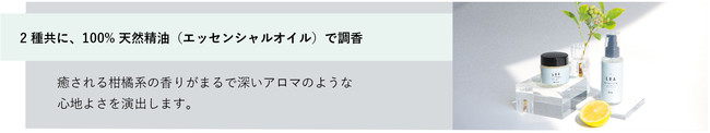 〈香り〉オレンジ・ライム・レモングラスなどの、12種の100%天然精油(エッセンシャルオイル)で調香