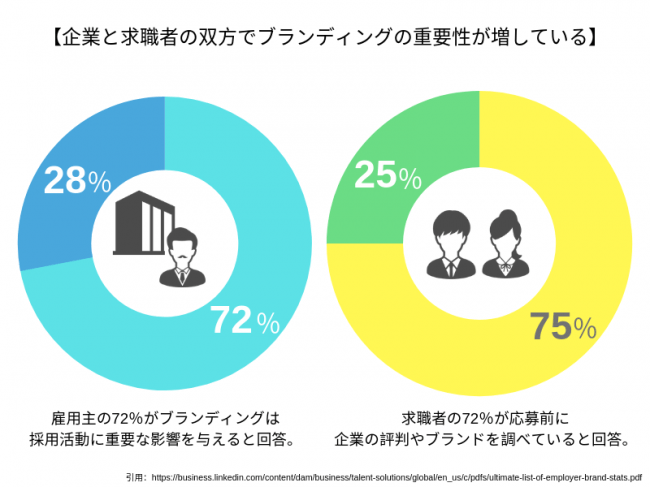LinkedInの調査によると、雇用主の75%がブランディングは採用活動に重要な影響を与えると回答。また、求職者の72%も応募前に企業の評判やブランドを調べているという結果も出ており求職者側もブランドへの意識が高まっている状況。