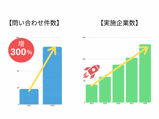 当社への依頼も採用ブランディングを目的としたものが過半数を占めており、問い合わせ件数は2017年と比較し、300%増。実施企業数も年々増加しつつあり、採用ブランディングへのニーズが拡大しています。