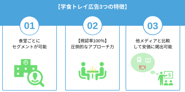 「学食トレイ広告」は注文の待ち時間からお食事中、おぼんの返却時まで常に視界に入るため、接触時間が非常に長い媒体です。また、学食を毎日利用する学生も多く、反復して刷り込みが可能なため視認率の高さも大きな特徴になっています。