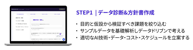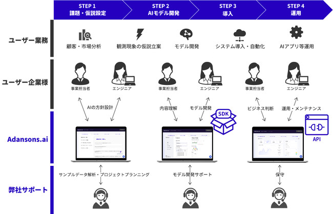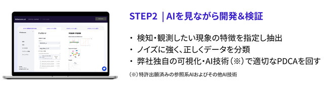 Adansonsの可視化・AI開発技術をどなたでも使える「Adansons.ai」で、貴社エンジニアはビジネス要件および観測現象の仮説をAIモデル開発に落とし込むことができ、事業担当者は仮説とAIの結果の結びつきを理解できるため、適切な事業判断および顧客・関係者とのコミュニケーションを取ることができます。