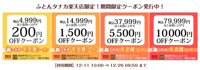 税込4,999円以上のお買い上げで200円OFFクーポンから、税込79,999円のお買い上げで10,000円OFFになるクーポンまで、4種のクーポンを26日9時59分まで発行中です。上質な寝具をお買い得価格でご購入頂けるチャンスですので、是非ご利用ください。※セールページ内に設置しています。