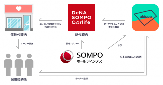 株式会社DeNA SOMPO Carlife(本社:東京都渋谷区、代表取締役:中島 宏、以下 DeNA SOMPO Carlife)は、akippa株式会社※ (本社:大阪府大阪市、代表取締役社長 CEO:金谷 元気、以下akippa社)と駐車場シェアリングサービス『akippa』を取り扱う保険代理店の全国展開に向け、業務提携契約を締結しました。