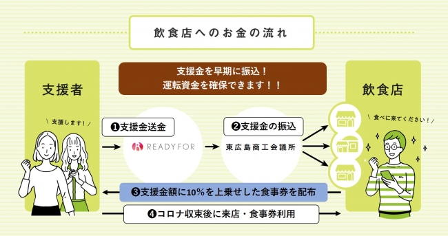 その経営の火を消さないため、本プロジェクトでは東広島商工会議所がクラウドファンディング実行者となり、専用ページを作成して支援金を募集し、集まった支援金を参加店舗に届けます。