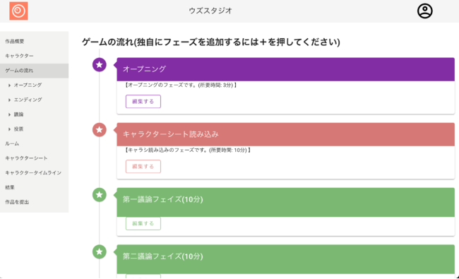「キャラクターシート」や「エンディング」、「投票」など必要な項目を入力すると審査に提出でき、審査を通過するとマーダーミステリーアプリ「ウズ」に掲載されます。