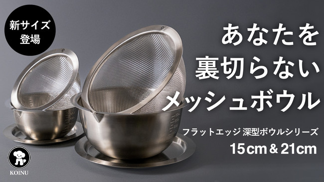 プロに信頼される厨房製品を生み出す「仔犬印」ブランドの本間製作所から、前回のプロジェクトで多くの方にご支援いただいた「裏切らないメッシュボウル」の新サイズが登場。21cmと15cmという取り回しやすい2つの組み合わせが、「良い道具」としてあなたの料理の良きパートナーになります。