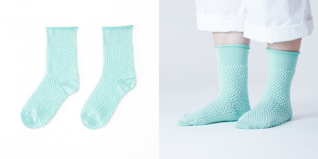 しめつけない製法をベースに、前面を汗や水分を放出しやすいメッシュ編みにすることで、吸湿性・放湿性があります。