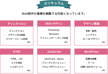 カリキュラム:Web制作の基礎を網羅する内容となっています