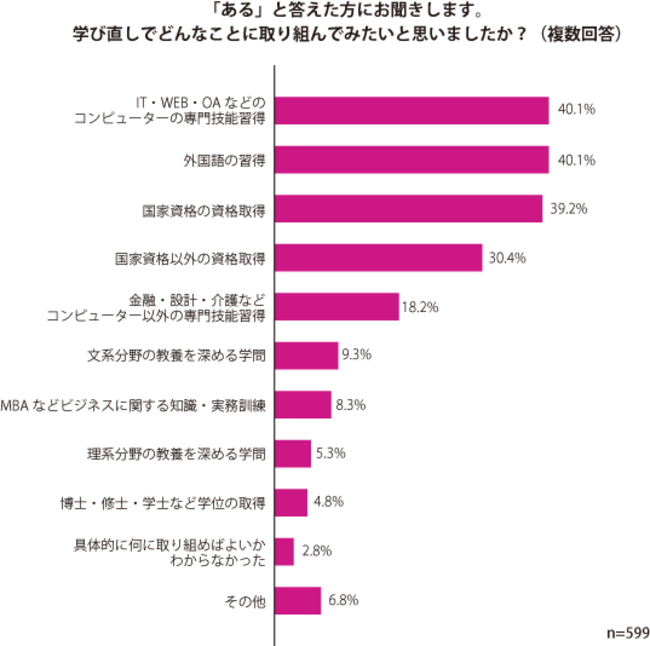 また、同じく主婦層に“学び直しで取り組みたいこと”を聞いたところ、1位は語学と並んで「IT・WEB・OA」となり、40.1%の人が希望するという結果になりました(※2)。
