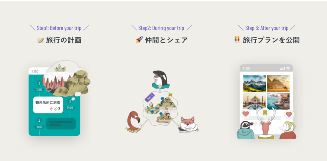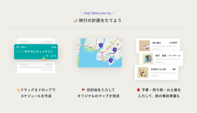 同じ趣味や嗜好を持った方の旅行プランを見つけたり、それらをカスタマイズして自分だけのオリジナルプランを計画することができます。旅先の点在するスポットを保存するだけに留まらず、旅行計画に必要な「お土産・持ち物・予算」などの管理、一緒にいく仲間に旅レシピを事前に共有することで、旅の道中を快適にし、旅行中の体験をより具体的に想像でき、旅をもっと身近なものにしてくれるプラットフォームを目指します。