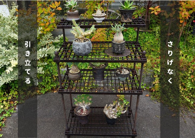 無骨な建築資材、グレーチングとボルトで作られたシェルフは、飾り気はないですが、無駄のないインダストリアルな雰囲気であり頑丈です。また透水性と風通しがよいことから、コロナ禍で人気急上昇中の塊根植物や多肉植物を飾るのにとても愛称が良く、植物を飾るには最上段が片持ちになるタイプを選択すると、ひな段のようでステージ感が強まり、植物を引き立てることが出来ます。