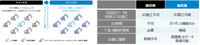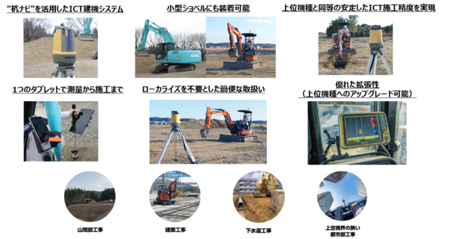 ICT機能のない従来型建機に後付けすることで、ICT建機と同程度の3Dマシンガイダンスやペイロード機能などのICT機能を利用可能とします。建機の効率化により、これまでよりも大幅に納期を短縮させながら、安全性・品質の向上にも貢献し、かつi-Construction指定工事にも対応可能になります。
