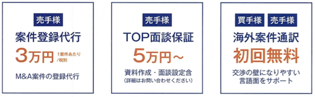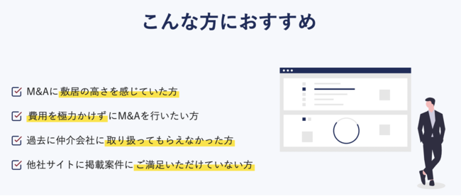 売手側、売手側アドバイザーの方は着手金や成約手数料の発生なく完全無料でご利用いただけます。