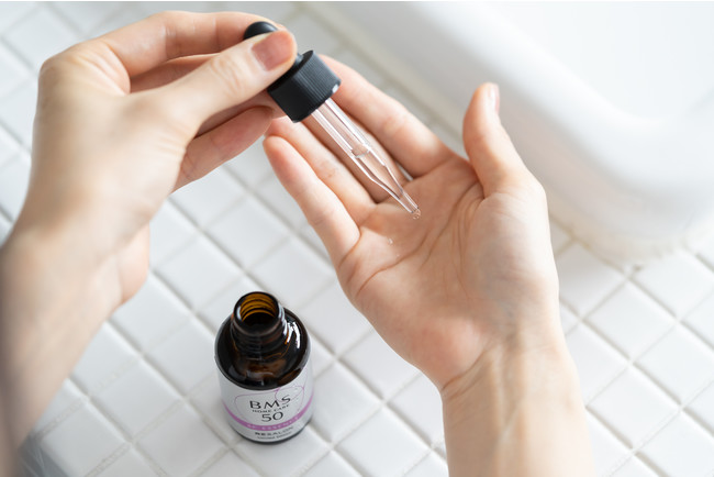 洗顔後、「BMS 50」を1スポイト(500 円玉くらい)手に取り、お顔や首に馴染ませてください。馴染ませた後は 1~3分ハンドプッシュし、肌の奥まで届けてください。その後、いつも通りのスキンケアを行ってください。
