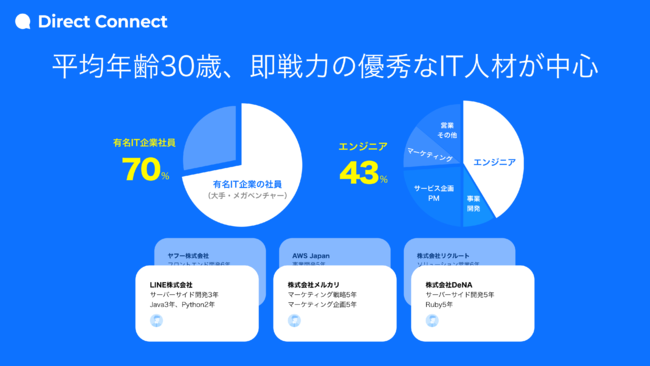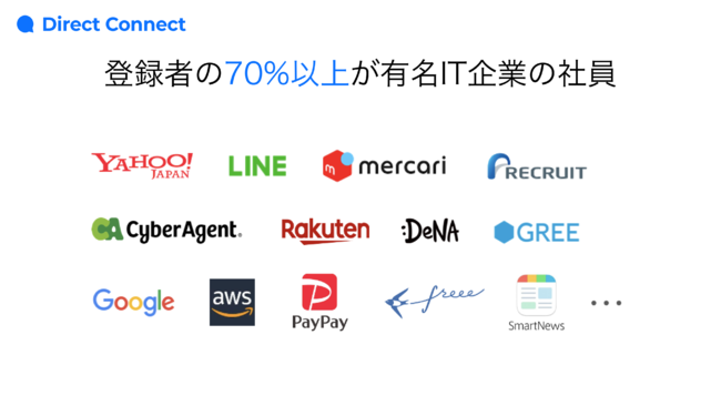 「Direct Connect」は有名IT企業の社員に、独自AIを用いて簡単に"お試し転職"のスカウトができるサービスです。求職者事前登録により、すでに800名にものぼるIT・Web人材の登録しており、登録者の70%がLINE、楽天、ヤフー、メルカリなど有名IT企業の社員で構成されています。