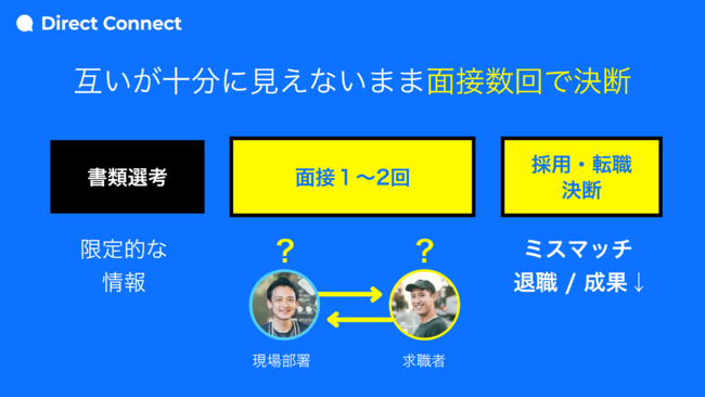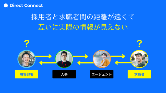 しかし、現場部署と求職者の間に人事担当者・人材紹介会社が挟まれることで、求職者・求人のリアルな情報が互いに見えず、両者のミスマッチ発生、または人材紹介会社に情報が独占されることで、無駄な工数がかかってしまう可能性があります。