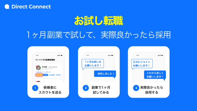 One day株式会社 (本社:東京都渋谷区、代表:カン テフン、以下「当社」)が運営するIT人材マッチングサービス「Direct Connect」は、新たに"お試し転職オファー機能" をリリースしました。求職者をまず1ヶ月副業で試して、実際良かったら採用する、ミスマッチ採用リスクを無くすスマートな採用サービスです。