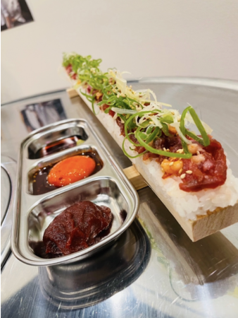 韓国で人気のユッケ寿司を、こだわりの桜ユッケを使って再現。目で見ても楽しめる一品です。