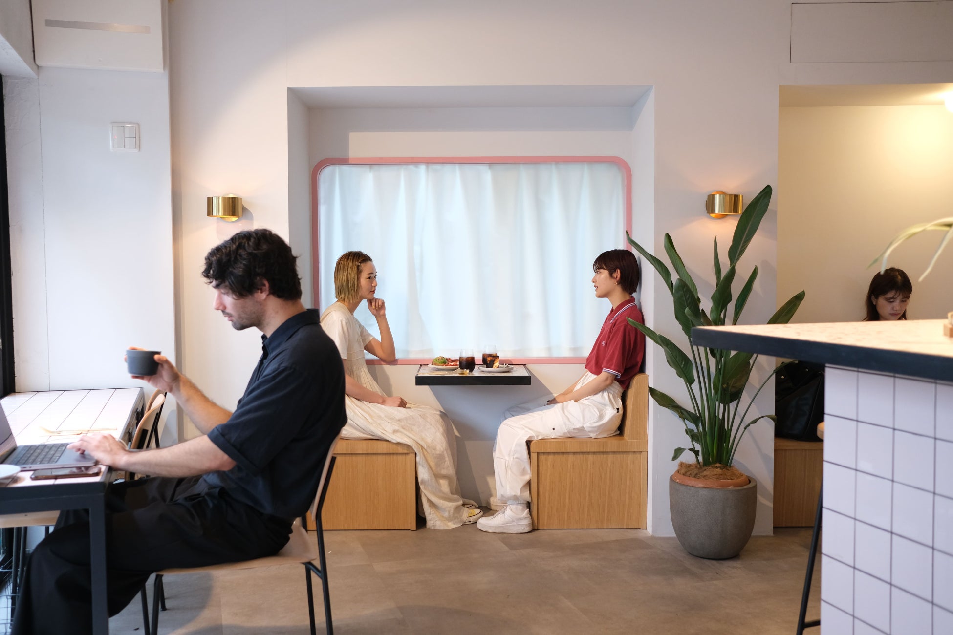 ピンクのタイルを使った唯一無二の空間に、自家焙煎のコーヒー、自家製の焼き菓子と、オーナーが京都など個別の茶農家まで直接出向いて仕入れている最高品質の抹茶の提供が特徴。