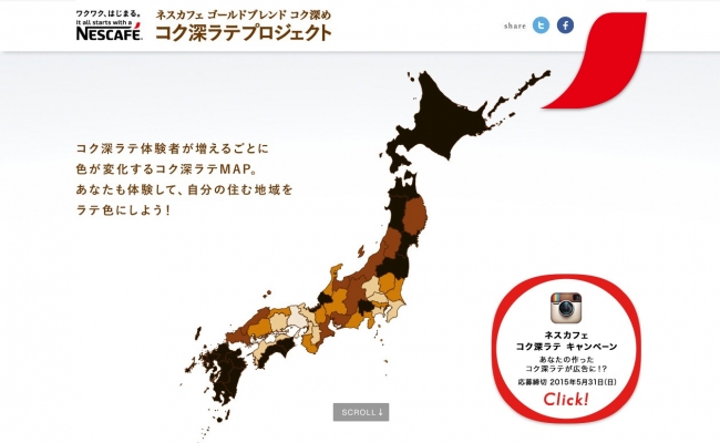 キャンペーンを通じて投稿された映像やSNSなどで広がる「コク深ラテ」への声は随時「コク深ラテ」プロジェクトのオフィシャルサイトに格納され、各県で体験者が増えていく様子が、日本地図の色合いの変化となって反映されていきます(*1)。 詳細は以下のサイトからもご覧になれます。