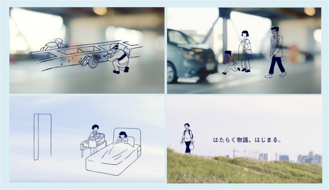 本ブランドCMでは、登場人物の「仕事」と、その先につながっている「暮らし」の何気ない風景を、手描きのアニメーションと実写背景を組み合わせた新感覚の映像で描きました。また、シンガーソングライターのタテタカコさん作詞・作曲のCMイメージソングにもご注目ください。ひとりひとりの「仕事」と「暮らし」をむすぶ物語、「はたらく物語」に寄り添うパートナーでありたい、という当社の想いを込めています。