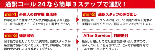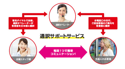あらかじめご登録いただいた事業者様の電話番号から通訳コールセンターのフリーダイヤルにお電話いただくだけで、日本語・英語・中国語・韓国語・ポルトガル語・スペイン語に対応した通訳オペレーターにお繋ぎします。外国人の来店など言語対応でお困りの際に、お電話口で交代していただくことで、用件の確認や伝達をお客様に代わっておこないます。24時間365日いつでもご利用いただけますので、緊急対応時にも安心のサービスとなっております。