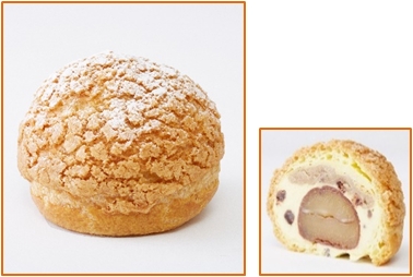 クッキーシューの中に、滑らかな食感のマロンクリームとチョコチップ入りのカスタードクリーム。さらに渋皮煮の栗が、まるっと一粒入っています。
