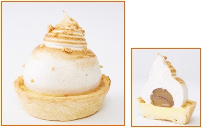 タルト生地に、はちみつをきかせたプリン、マロン風味のメレンゲの中に渋皮煮の栗が、まるっと一粒入ったタルトです。