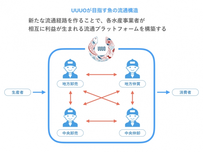 当社が開発する「スマホでつながる水産市場 UUUO 」は、産地と中央市場の水産事業者同士(卸売及び仲卸)が水産物の売買をインターネット上で行えるサービスです。UUUO上で、産地の水産業者は自由に採れたての魚を出品することができ、買い手側の水産業者は自由に買うことができます。