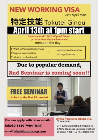New Working Visa-特定技能-seminar is coming on April 13th at Shin-Okubo, Tokyo.