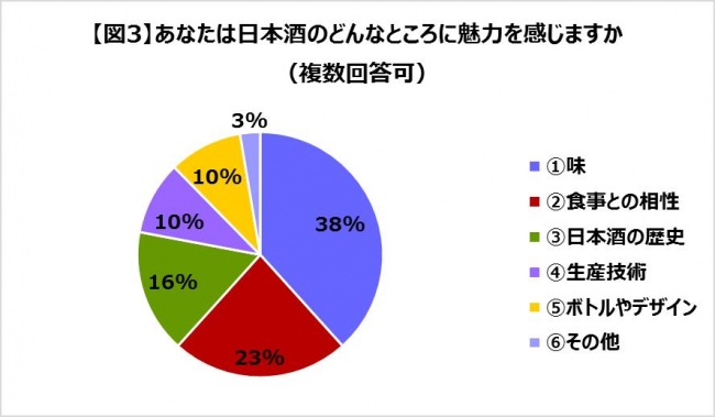 『日本酒をどのような時に飲みたいか』という質問に対して「日常の食事のとき」「特別な食事のとき」と食事に合わせて飲みたいと回答した人が全体の42%と半数近くになりました【図2】。また、『日本酒のどんなところに魅力を感じるか』という質問では、「食事との相性」と答えた人が「味」と答えた人に続き2番目に多い結果となり、お酒と食事という組み合わせが重要視されていると分かりました【図3】。また、今回の参加者からは、ワインに似ているので、白ワインに合う料理なら大抵の料理に合うという意見や、他のお酒と比べると癖がなく飲みやすいという意見が寄せられ、日本酒は様々な国の料理と相性が良いという結果になりました。